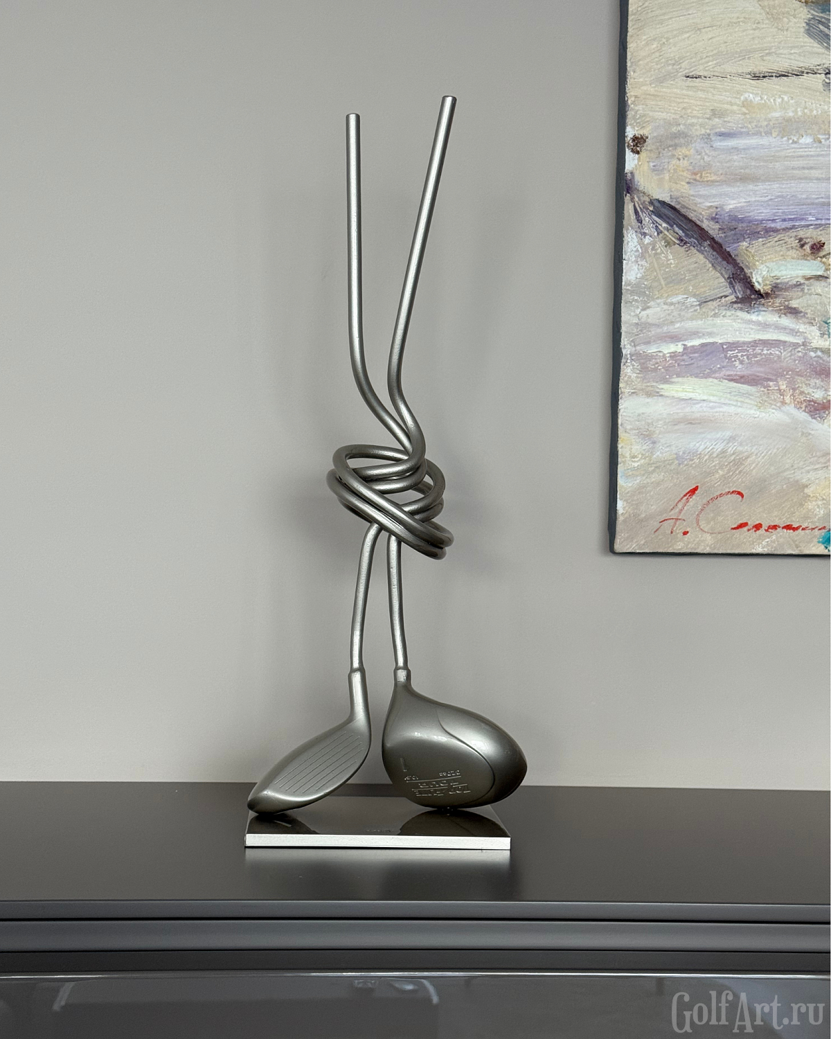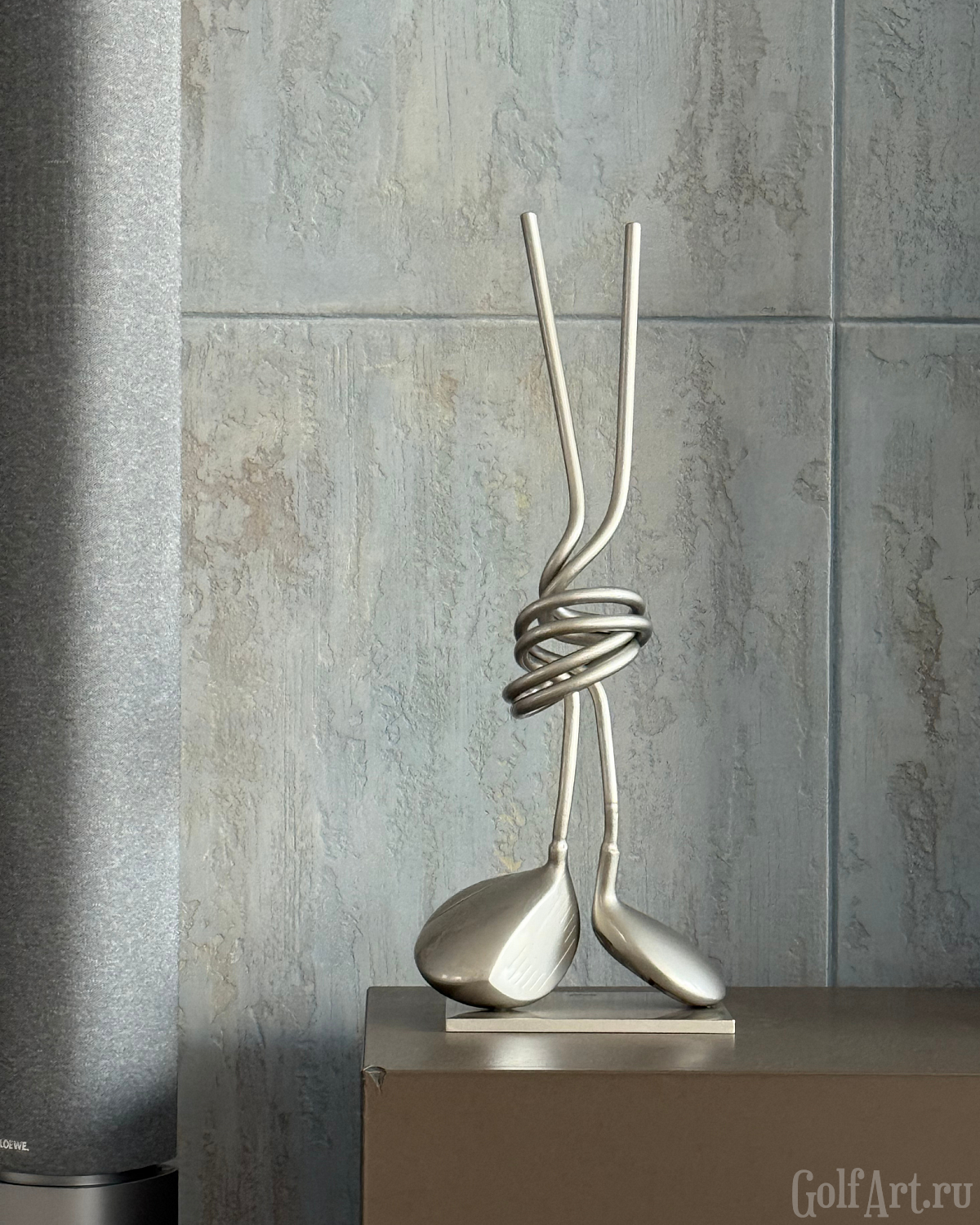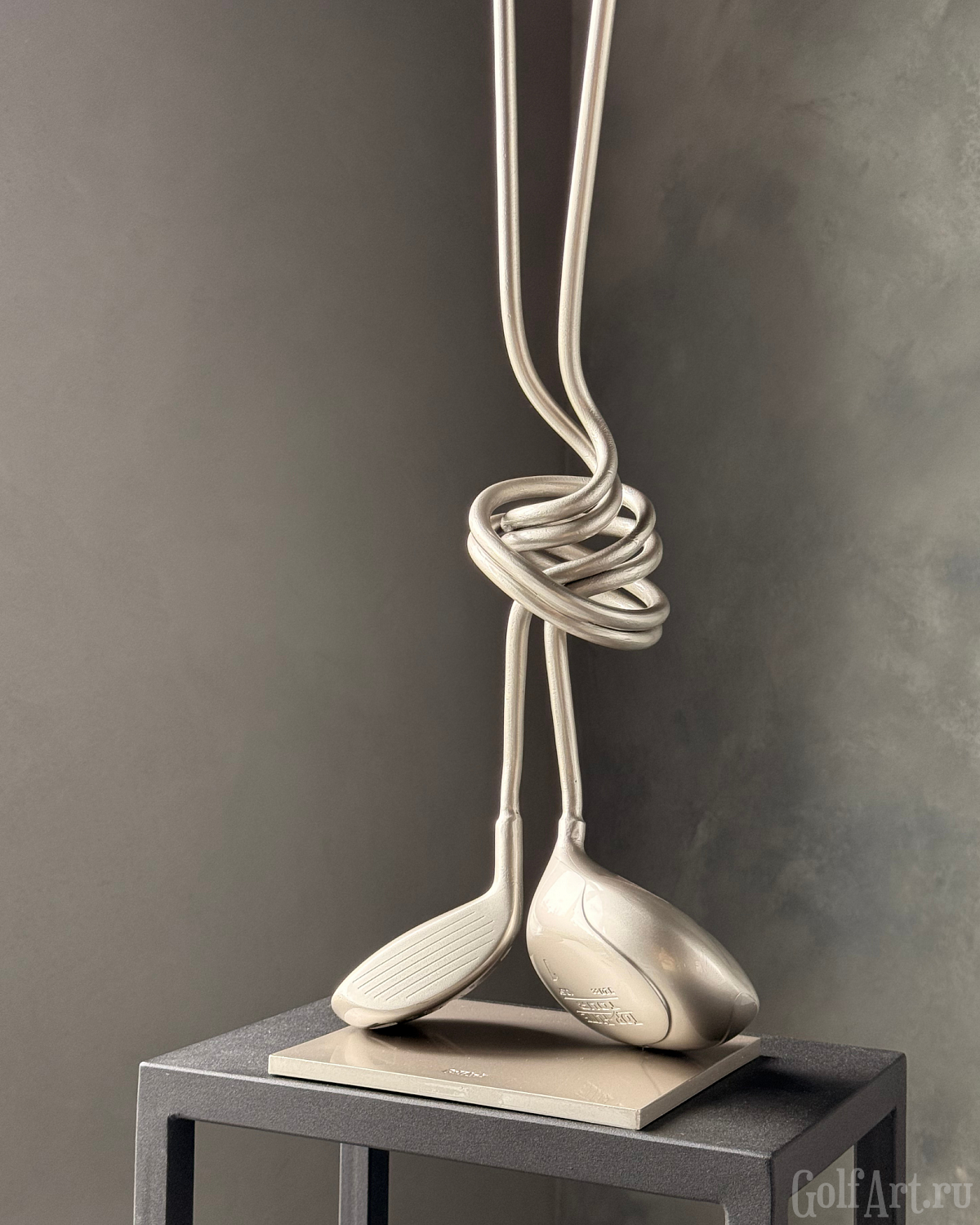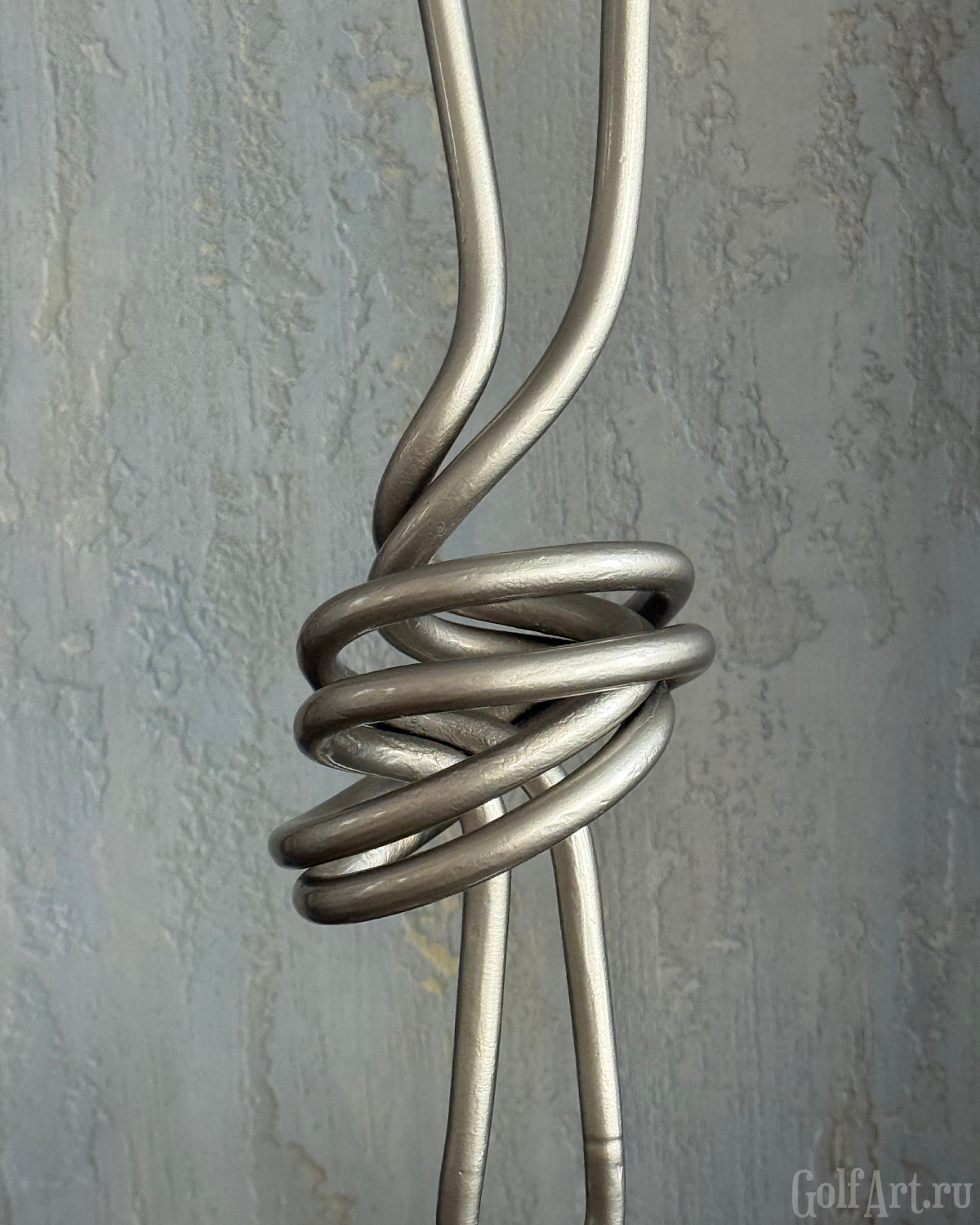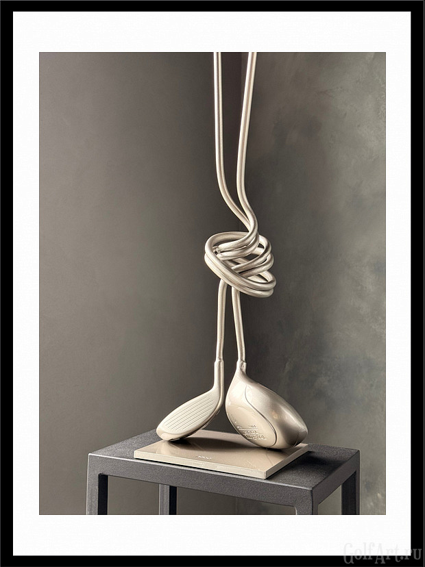 Две клюшки, сплетённые в один узел, - метафора внутренней собранности и полного присутствия в игре. Это момент, когда соединяются сила, точность и интуиция. Когда каждый удар часть целого, а каждая эмоция - отклик на тонкую связь с полем. «Связь» — это о соединении: с собой, с игрой, с моментом, в котором ты полностью присутствуешь. Это связь с партнёром, с которым идёшь по фервею в доверии. Этот арт-объект напоминает: настоящее мастерство рождается в ощущении единства с движением, с полем, с тишиной внутри. Р.S. При изготовлении используются настоящие игровые клюшки