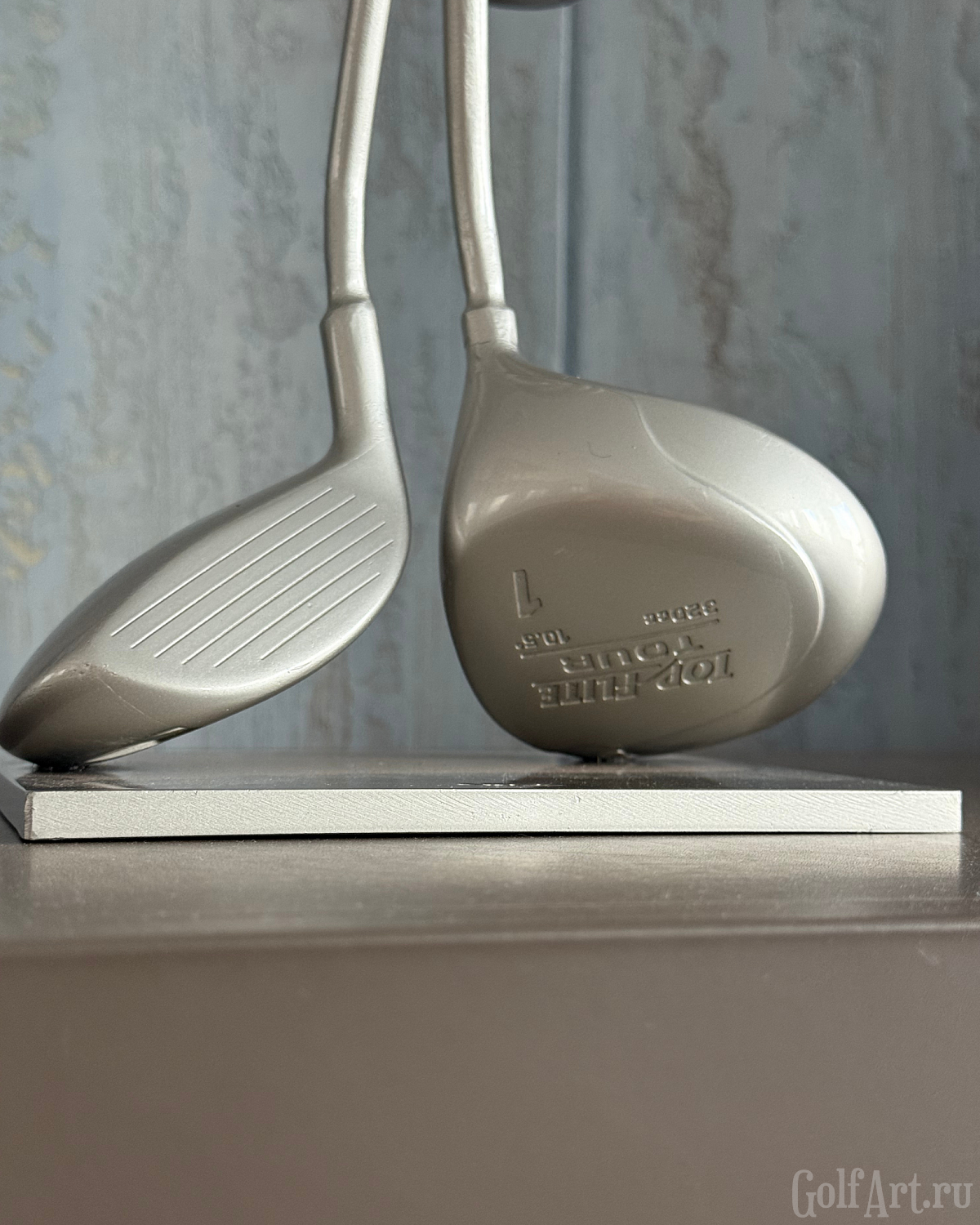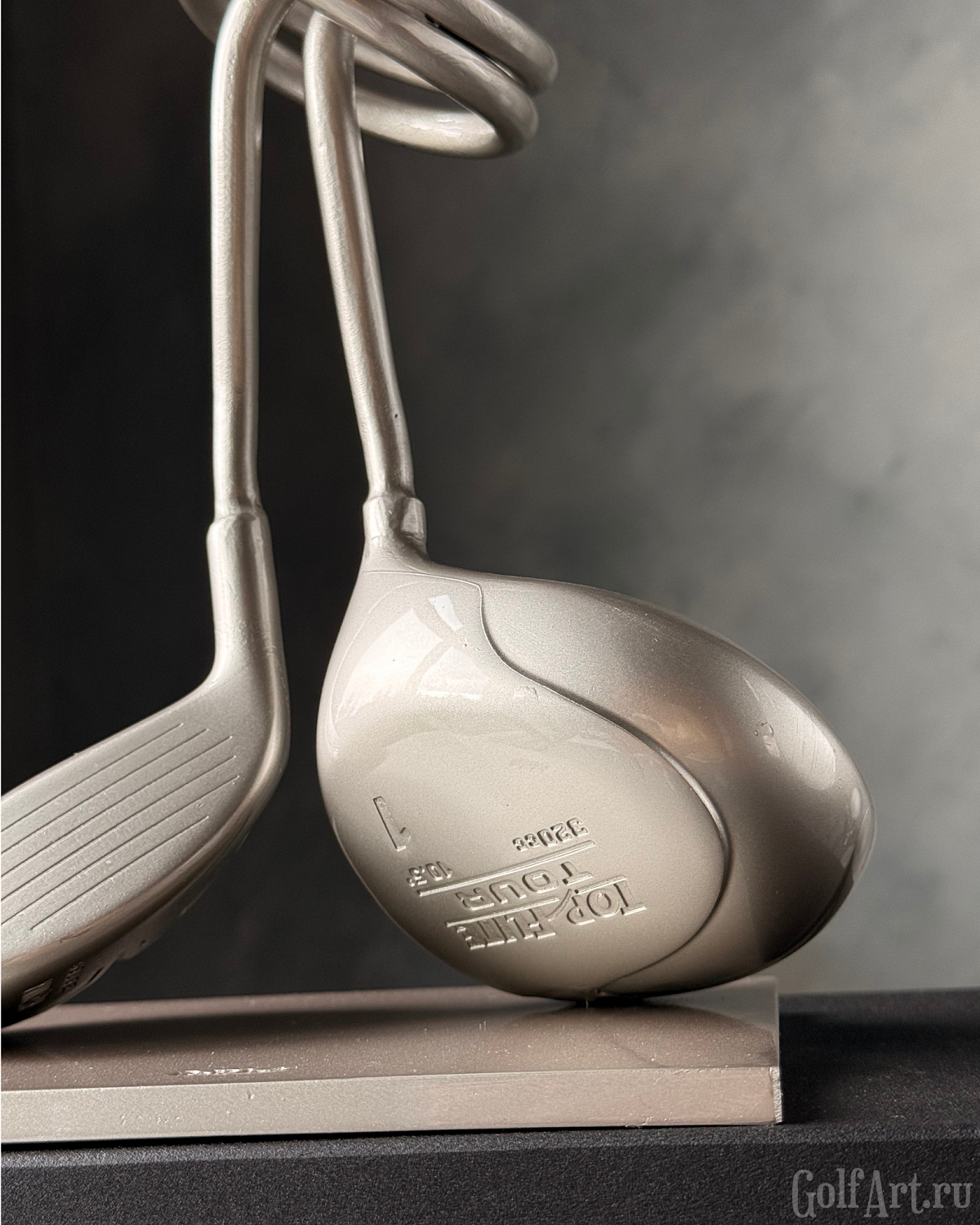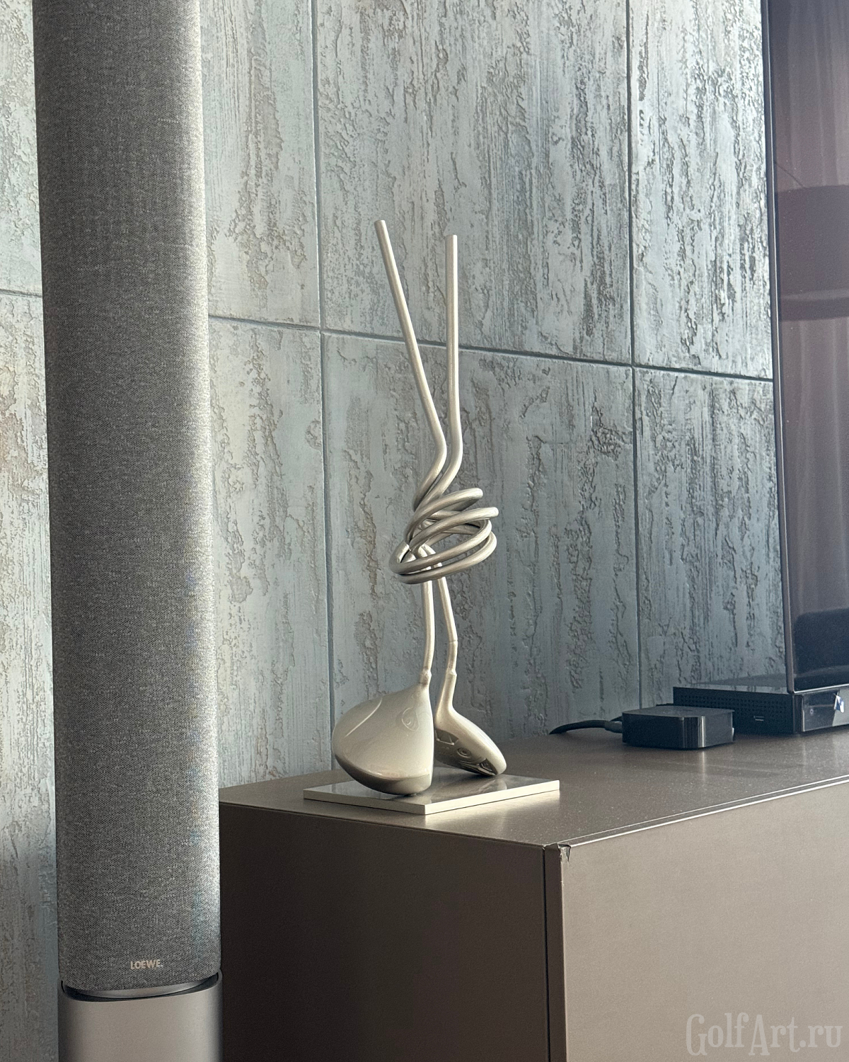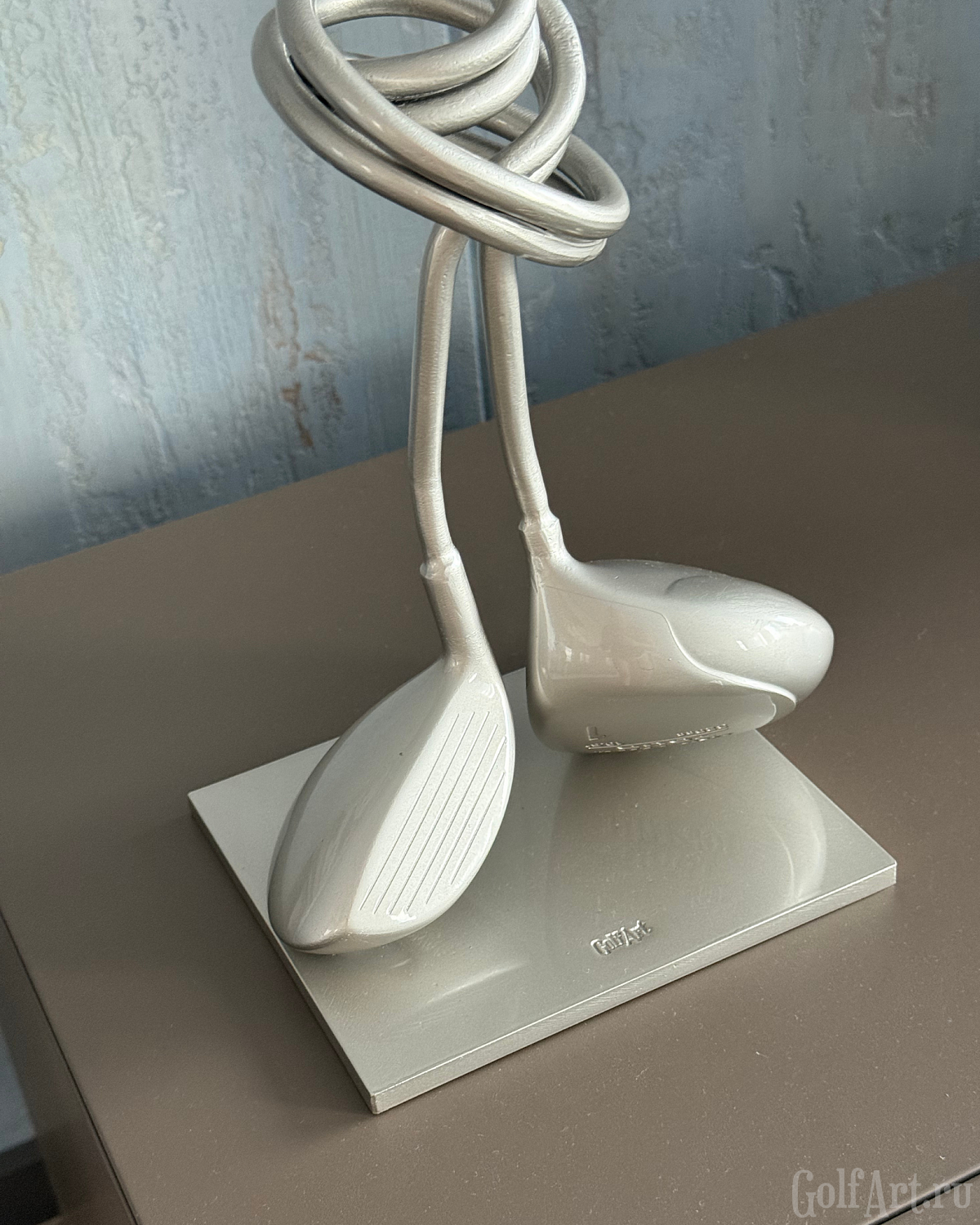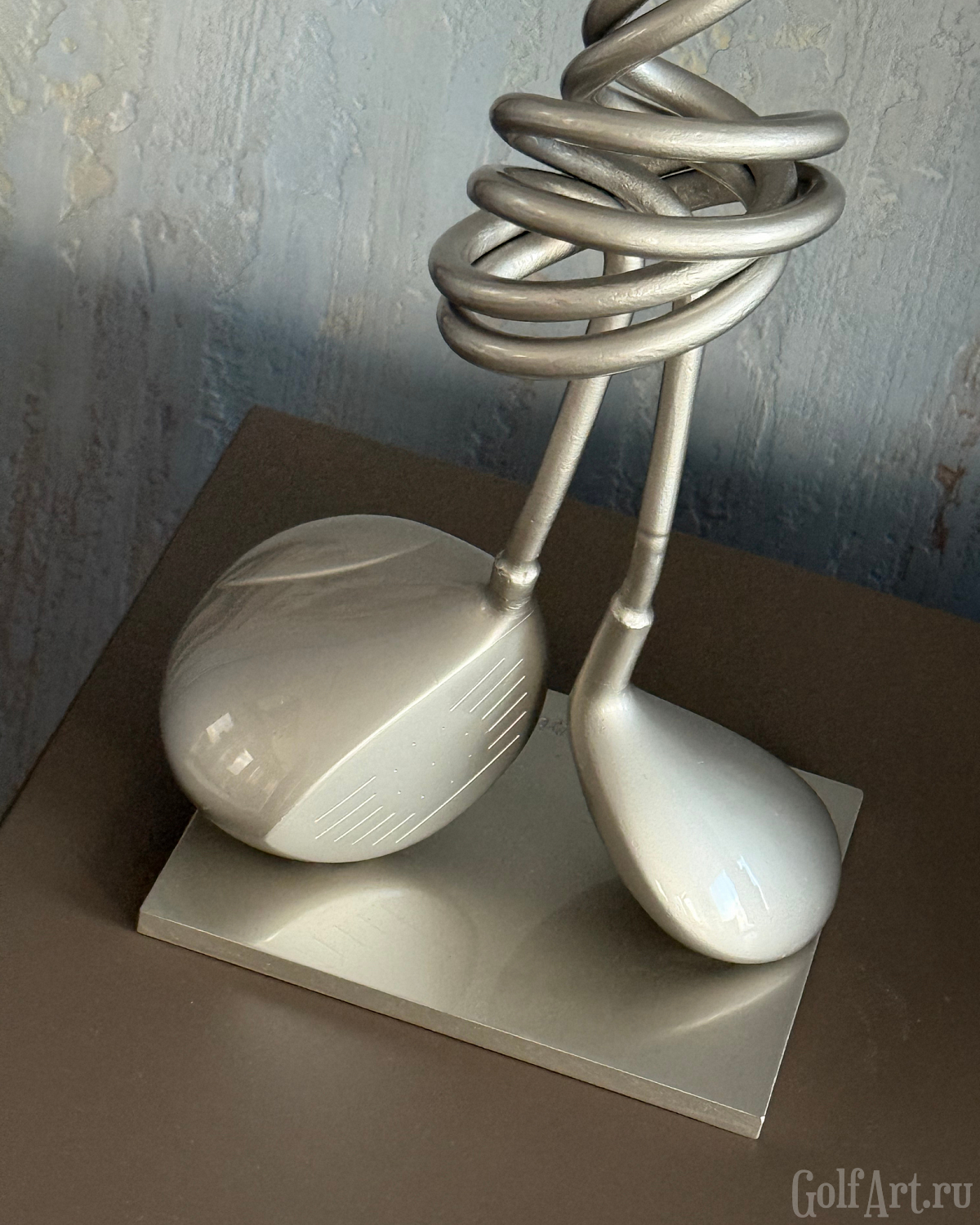 Две клюшки, сплетённые в один узел, - метафора внутренней собранности и полного присутствия в игре. Это момент, когда соединяются сила, точность и интуиция. Когда каждый удар часть целого, а каждая эмоция - отклик на тонкую связь с полем. «Связь» — это о соединении: с собой, с игрой, с моментом, в котором ты полностью присутствуешь. Это связь с партнёром, с которым идёшь по фервею в доверии. Этот арт-объект напоминает: настоящее мастерство рождается в ощущении единства с движением, с полем, с тишиной внутри. Р.S. При изготовлении используются настоящие игровые клюшки